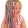 Confectionati si purtati extensii de par la moda si colorati-va parul cu creta speciala! Impletiti extensiile si impodobiti-le cu margele si si flori utilizand bagheta din set. Pentru colorarea parului, introduceti o suvita in dispozitivul cu creta speciala, presati la mijloc si trageti in jos. Creta e non-toxica si se indeparteaza usor.Contine: 2 dispozitive cu creta 2 extensii de par colorate 30 de margele in forma de inima 4 flori din material textil cu margele bagheta 20 elastice ghid de instructiuni Recomandat pentru varsta de 6 ani si peste. Avertismente! Nu este potrivit pentru copiii mai mici de 36 de luni. A se utiliza sub supravegherea unui adult.
