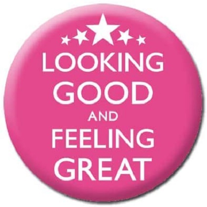 O frumoasa insigna rosie stralucitoare, cu cuvintele „Looking Good And Feeling Great” cu majuscule albe.