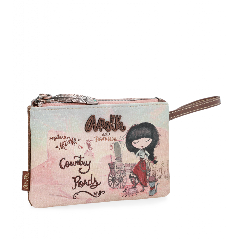 Portofel Anekke prevazut cu o curea pentru incheietura mainii ce poate fii folosit si ca o mini poseta.Anekke este un brand spaniol de genti, rucsaci si accesorii ca: genti pentru cosmetice, penare sau portofele. Linia de design se concentreaza pe crearea unei atmosphere nostalgice de basm, cu linii subtile, tonuri cafenii, stil feminin, jucaus, cu finisaje elegante si atentie la detalii. Produsele Anekke sunt mici opere de arta care transcend intr-o lume a fanteziei, acolo unde eroina este o fata enigmatica cu parul brunet, pe nume Anekke, capabila sa transmita sensibilitate prin lucrurile cele mai simple si naturale. Articolele incanta printr-un finisaj si materiale de calitate. Gentile Anekke sunt foarte practice, confortabile si versatile.